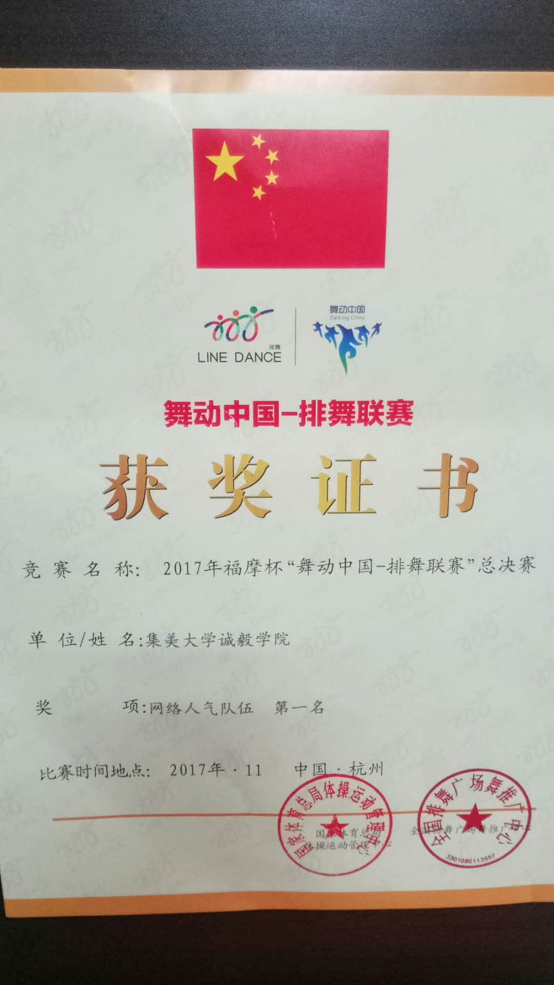 2017年11月25日,由国家体育总局体操运动管理中心、杭州市体育局、杭州市滨江区人民政府主办的2017年福摩杯“舞动中国-排舞联赛”的总决赛在杭州滨江体育馆举行。集美大学诚毅学院代表队荣获多个奖项。同时,在“阳光排舞进校园”星级示范学校授牌仪式上,诚毅学院获得“阳光排舞进校园”最高等级的“五星级示范学校”。