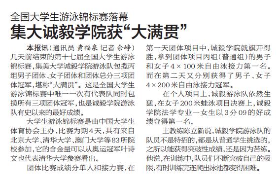 11月27日,《厦门日报》A06报道集美大学诚毅学院在全国游泳锦标赛获奖消息,现全文转载如下: